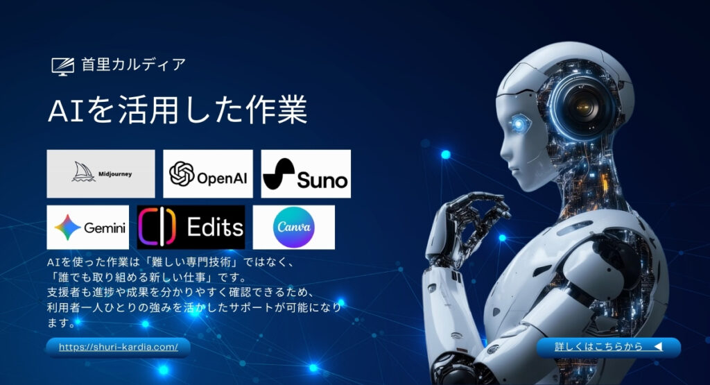 AIを活用した新しい作業内容のご紹介 当事業所では、利用者の皆さまが自分の得意を活かしながら無理なく取り組めるよう、AI(人工知能)を活用した作業をご用意していま... -